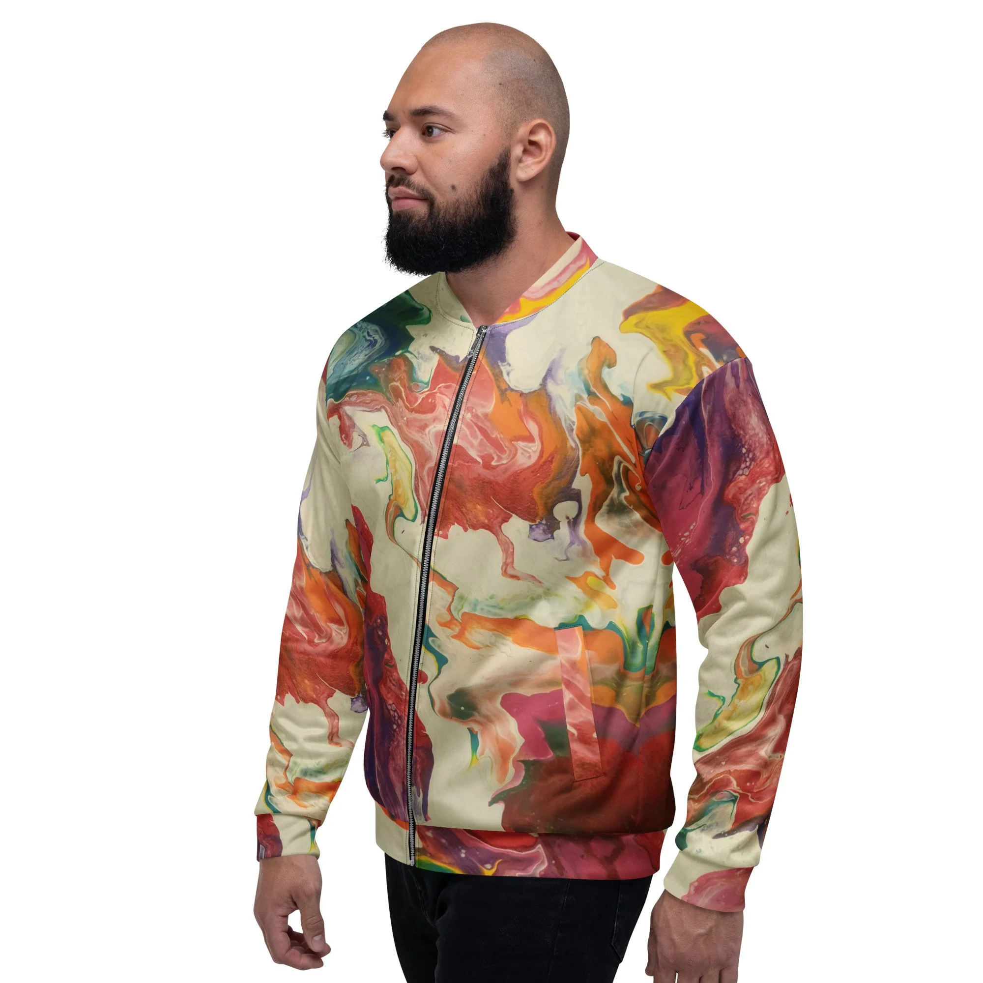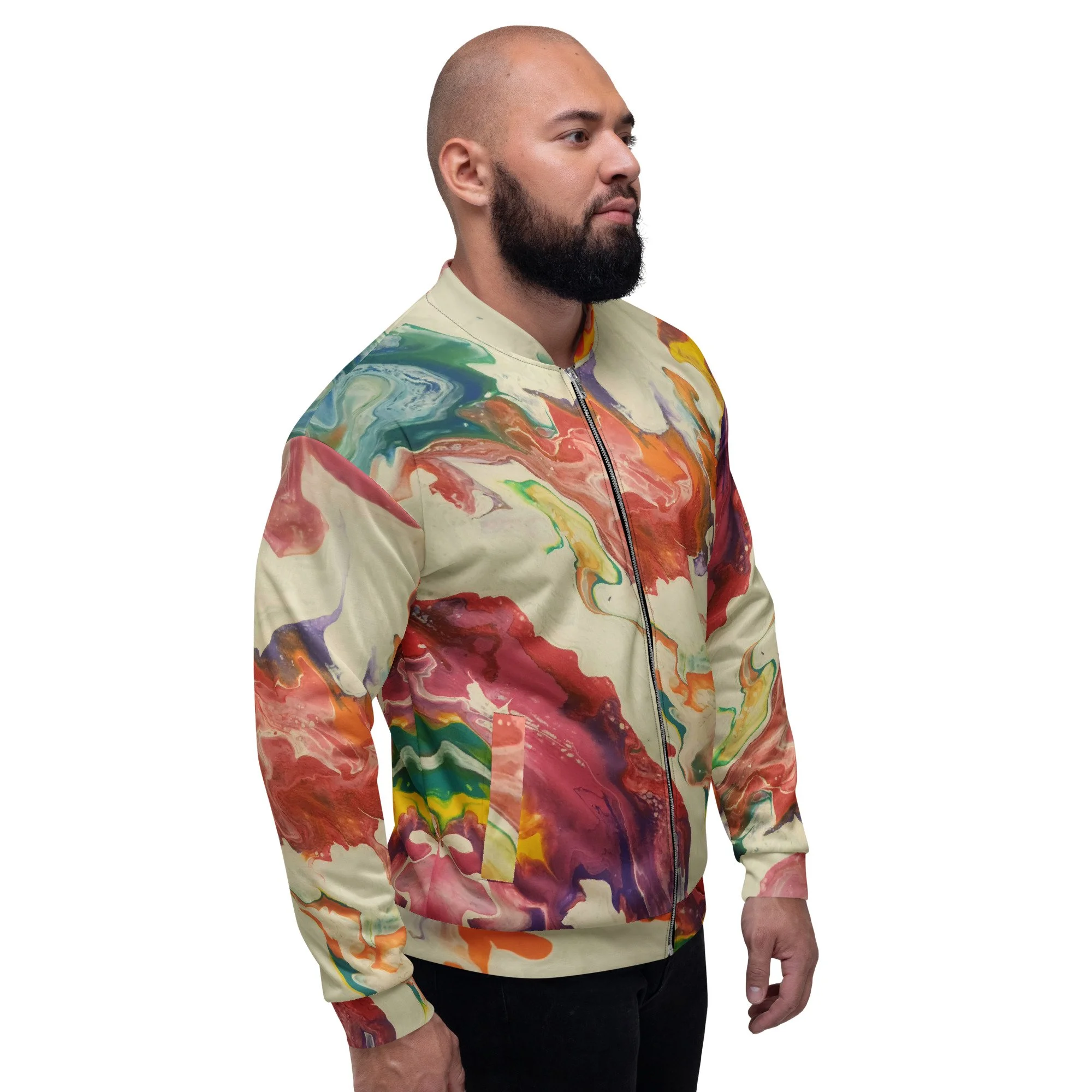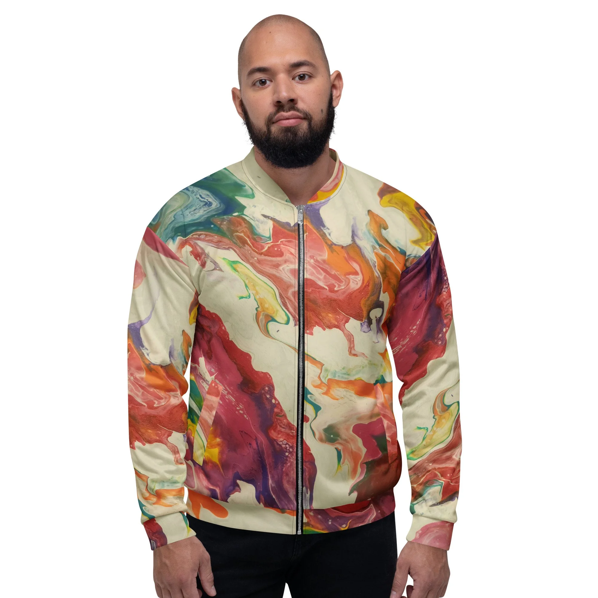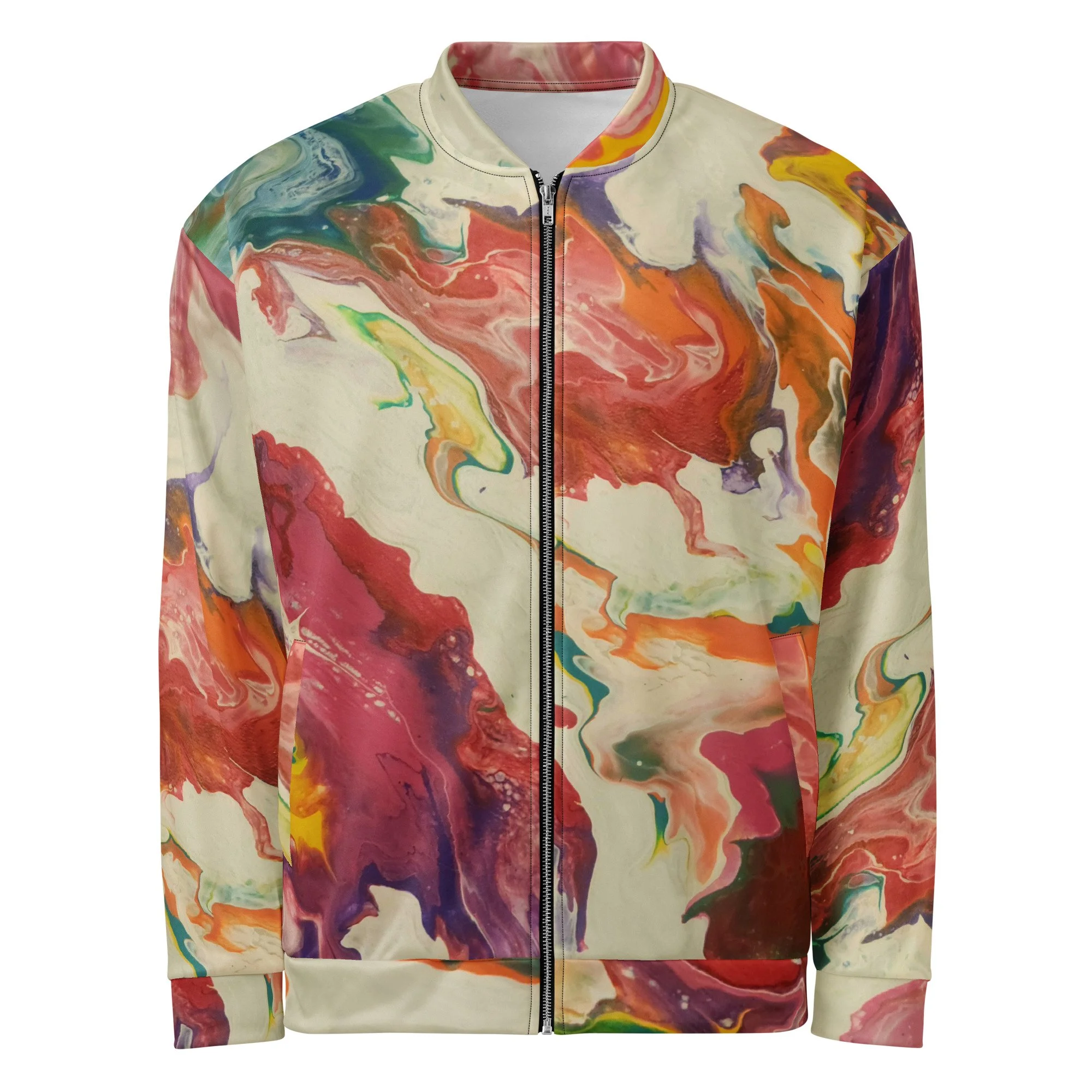 Add a little zing to your wardrobe with this vibrant All-Over Print Bomber Jacket. Wear it on a basic t-shirt, or layer it on top of a warm hoodie—it’ll look great either way. With a brushed fleece inside, and a relaxed unisex fit, this Bomber Jacket is just the stuff of the dreams, so be quick to grab yourself one!