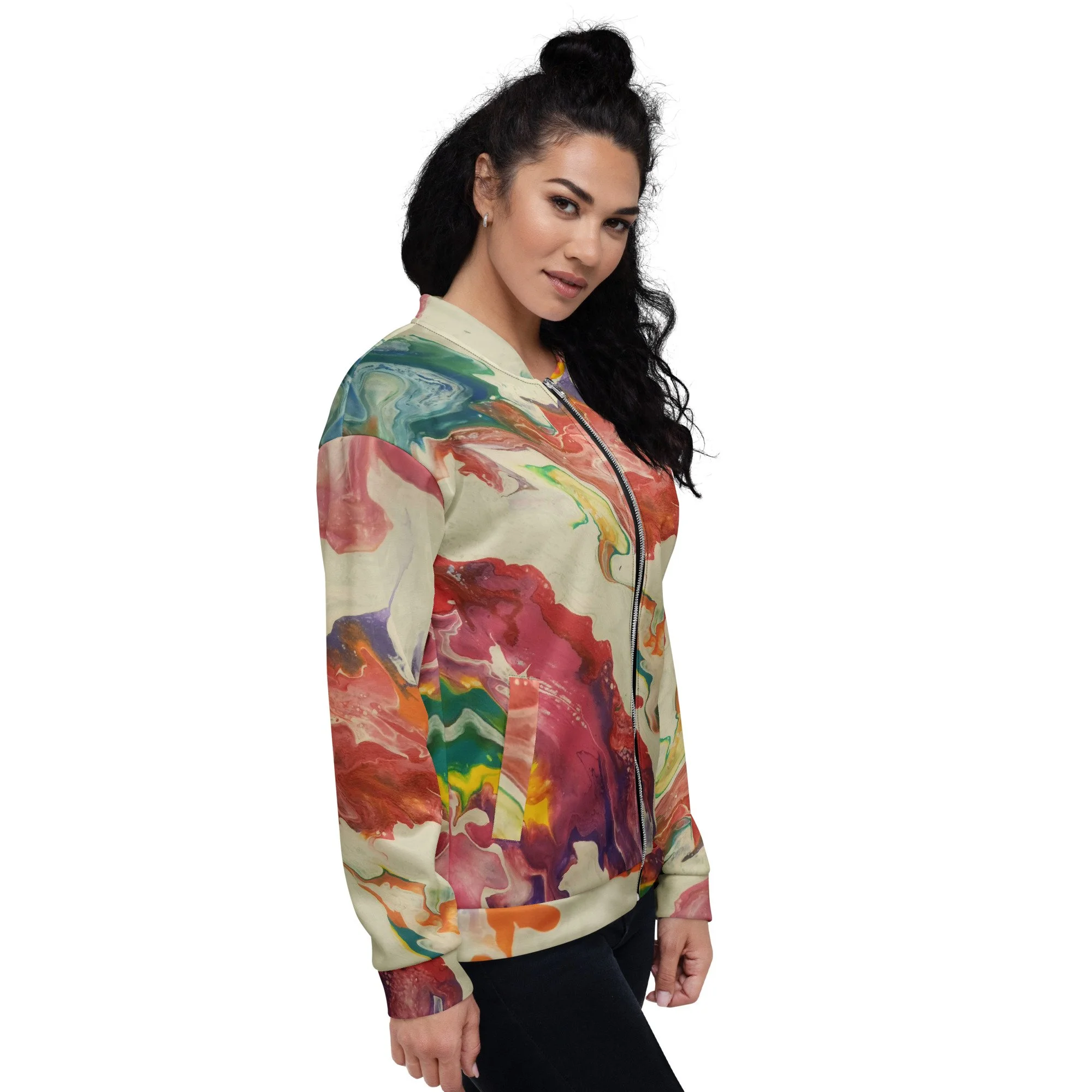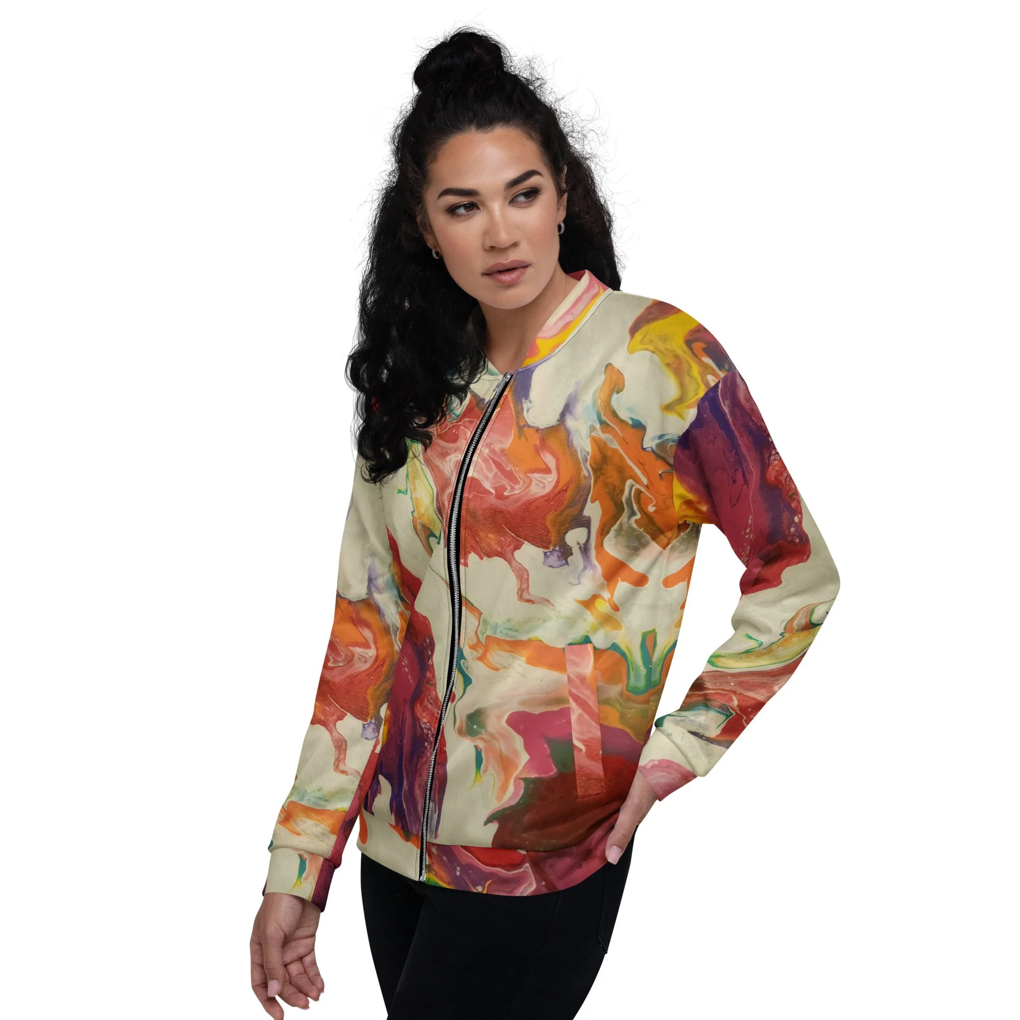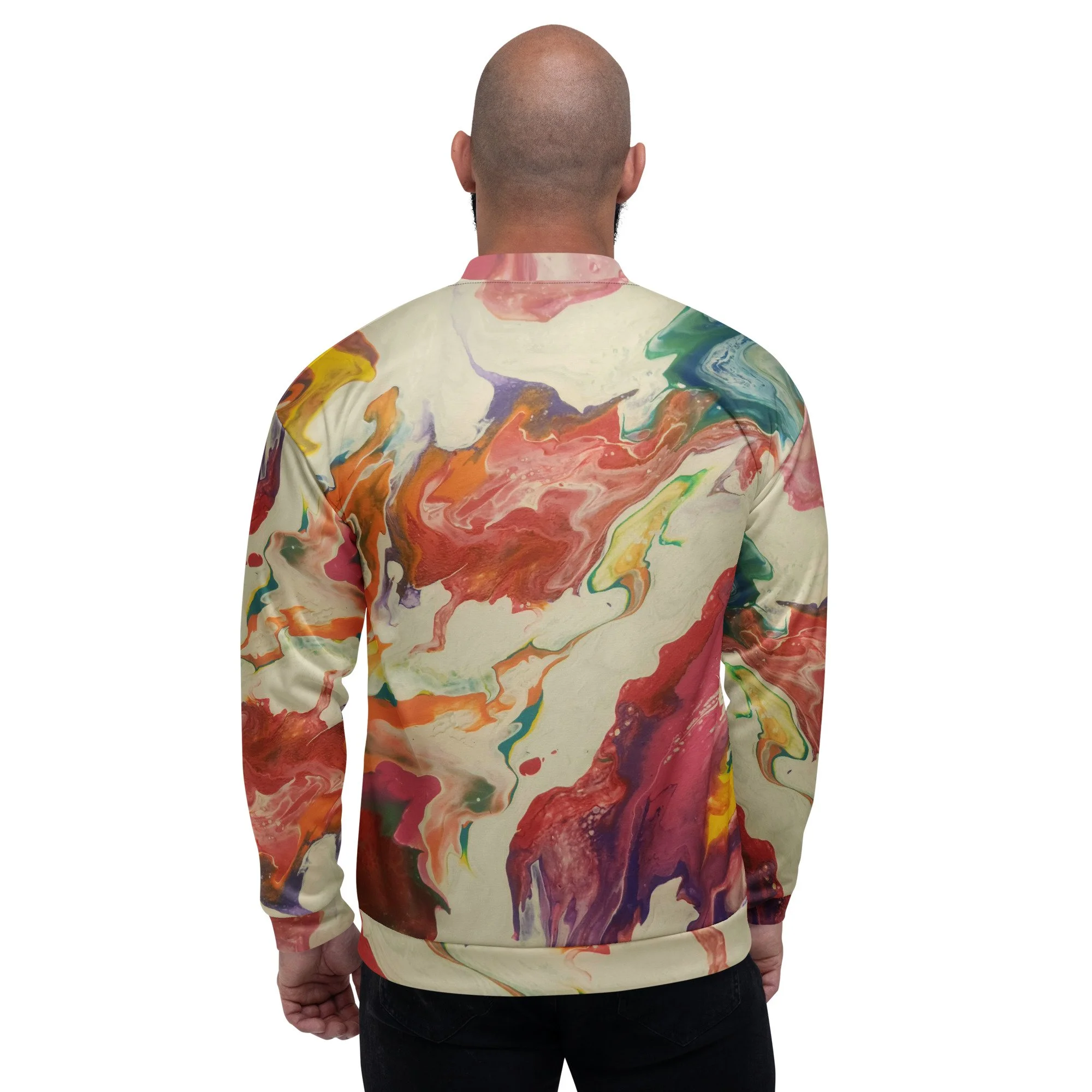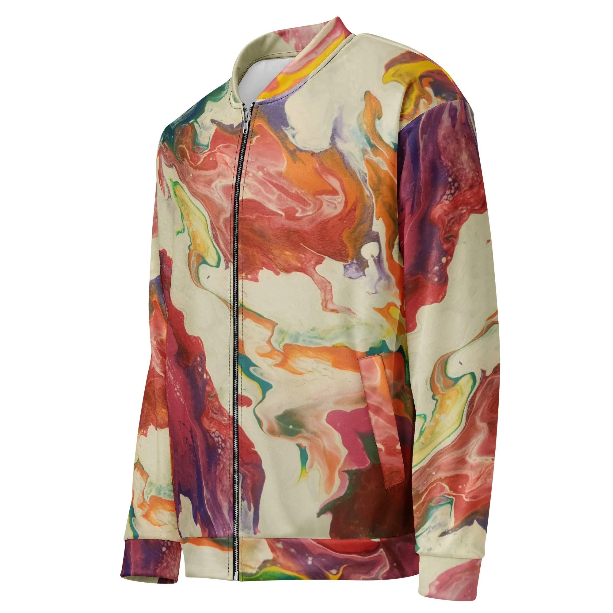 Add a little zing to your wardrobe with this vibrant All-Over Print Bomber Jacket. Wear it on a basic t-shirt, or layer it on top of a warm hoodie—it’ll look great either way. With a brushed fleece inside, and a relaxed unisex fit, this Bomber Jacket is just the stuff of the dreams, so be quick to grab yourself one!